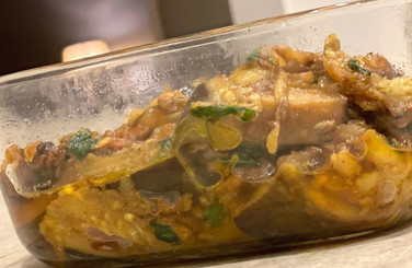 Take all the eggplant pieces and potatoes and marinate them all with salt and turmeric about one and a half teaspoon of each is needed and marinate them well. Leave it aside for a few odd minutes while you pour a generous amount of mustard oil for frying. Fry eggplant and potatoes evenly. Take it out of the oil and leave them aside.